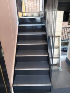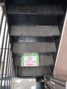 退色やひび割れ、階段も経年劣化によるサビが発生しております。
