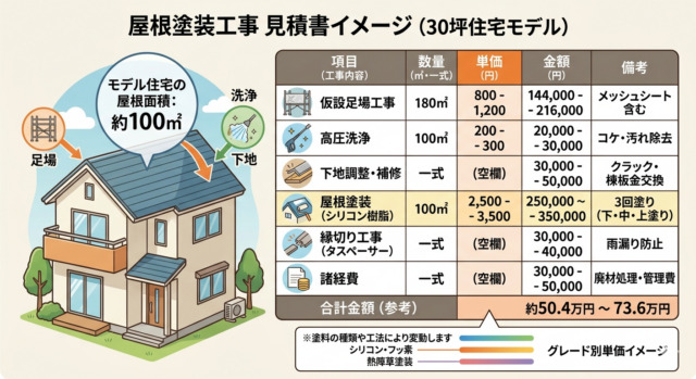屋根塗装の費用は、単純に塗料代だけで決まるわけではありません。実際には複数の費用が組み合わさって見積もりが構成されています。