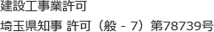 | 許認可 | 宅地建物取引業許可 宅地建物取引業者免許証 埼玉県知事免許(1)第25407号 |